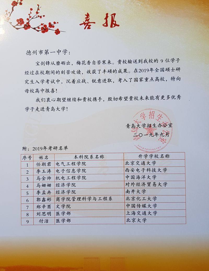 近日,青岛大学向我校发来喜报,祝贺我校输送到青岛大学的9位学子在2019年全国硕士研究生入学考试中,考入国家重点高校;同时也祝贺我校在2019年高考中有24位学子以优异成绩被青岛大学录取。喜报称:多年来,我校一直为青岛大学输送优秀高中毕业生,感谢我校为人才培养付出的心血。